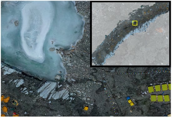 Close-up aerial view of basecamp showing where tents are erected. Darker soil indicates supraglacial water flow. Image by Virtual Wonders and National Geographic.