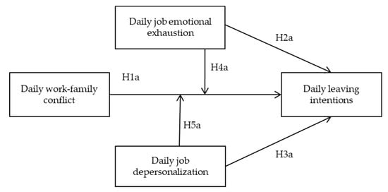 The stress generated by work-family conflicts may lead workers to consider leaving their profession, their job or the organization they work for in order to resolve the conflict and reduce the stress they are currently experiencing []. However, this link between work-family conflict and leaving intention has not been tested yet over short periods of time or using a diary method, with most of the studies in this area being cross-sectional studies []. Studying the association between these two variables on a daily level implies accepting work-family conflict as a dynamic experience that can vary depending on certain contextual or personal variables, with consequences that also vary [].