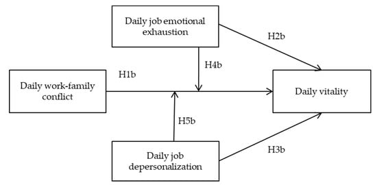 Daily work-family conflict will be more negatively associated with daily vitality (5a) on days where healthcare workers feel more job emotional exhaustion as opposed on days where they feel less job emotional exhaustion; and (5b) on days where healthcare workers feel more depersonalization as opposed on days where they feel less job depersonalization.