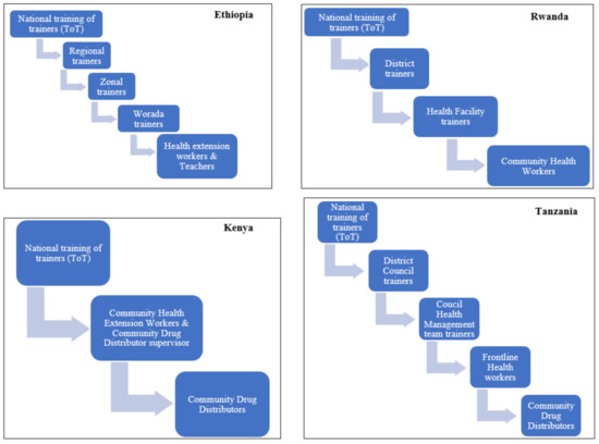 All of the NTD programs in the four countries used the training of the trainers’ cascade model, as shown in Figure 1. The trainings were mainly focused on the implementation and coverage of MDA, but a small component of medicine safety as part of the pre-MDA trainings was given. In all four countries, the number of personnel trained during the last 12 months is presented in Table 2.