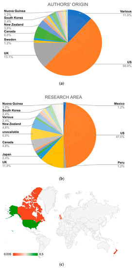 (a) Origin of the publications’ authors; (b): Geographical areas of research; (c): Geographical interest of the research topic.