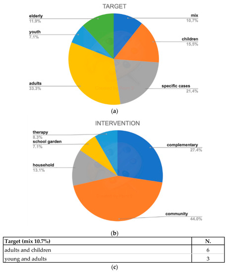 (a) Type of activity/intervention; (b)Garden-based activities target to different groups. (c) details on the mixed age-groups.