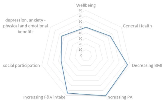 When attempting to quantify the potential benefit of the community garden on the different dimensions of health and well-being, a radar chart analysis was performed (Figure 5).