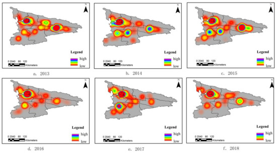 Kernel density maps for hand-foot-and-mouth disease (HFMD) from 2013 to 2018. ((a). 2013, (b). 2014, (c). 2015, (d). 2016, (e). 2017, (f). 2018).