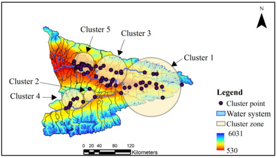 Space–time cluster analysis using SaTScan identified five space–time clusters of HFMD cases in the Ili River Valley region from 2013 to 2018 (Table 1, Figure 2), and there was a difference between the results and the HFMD annual variation based on kernel density analysis. The most likely cluster was seen in the northeastern district from April to September 2013. Another cluster was seen in two southwestern districts, clusters three and four, from May to October 2018. A significant spatiotemporal cluster was detected south of Tekesi city from February to April 2016. The results show that five potential clusters were distributed along the Ili and Gongnaisi river basins.