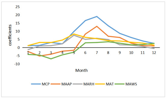 From February to September, the incidence rate of HFMD varied significantly according to climate factors, with a positive correlation of MCP, MAT, and MARH. From February to August, the MAT and MARH fit curves showed an inverted V-shape. As temperature and humidity increased, the incidence rate of the disease showed an upward trend, with the effect being most pronounced in May. From January to May, the fitted curves of MAAP and MAWS showed a U-shaped change and a negative correlation with the rate of HFMD. The relationship between climate factors and HFMD showed fluctuating changes in spring, more significant changes in summer, and it gradually weakened in autumn and winter. The change in the fitted MCP curve was consistent with the annual precipitation pattern of the region, which is four consecutive months from April to July; the fitted curve showed an increasing trend, indicating that precipitation during this period contributed to the spread of HFMD. The MAT coefficient was positively correlated with an inverted V-shaped curve, and the incidence rate showed an increasing trend with increasing temperature; this was most significant in May. The MAT fitted curve was consistent with the change in the MARH curve, probably because HFMD is more active in humid and hot environmental conditions. The seasonal variation of wind speed in this region is characterized by maximum wind speed in spring, then summer, and the minimum is in winter. The MAWS coefficients varied more significantly, but the overall fluctuation was characterized by change.