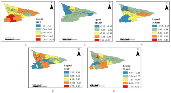 Spatial distribution of the coefficients for climate factors. ((a). MCP, (b). MAAP, (c). MARH, (d). MAT, (e). MAWS).