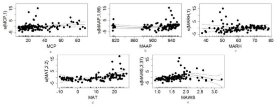 Table 4 shows the results of the GAM analysis. The variance inflation factor (VIF) values of all variables were less than 10, so it could be assumed that there was no multicollinearity between the variables, and all selected variables were involved in the model. The results of the smooth function test of MCP, MAAP, MAT, and MAWS were statistically significant, and the MARH was not statistically significant. For the model fitting results, R2 was 0.474, the variance explanation rate was 52.6%, and the GCV value was 8.8745. Additionally, the intercept is 2.20471, significantly correlated at the p = 0.001 level. The influence of the explanatory variables was measured by the magnitude of the F value, which shows that F (MAT) > F (MAWS) > F (MCP) > F (MAAP), where the F value of MAT had a larger variance than the other three climate factors. This indicates that MAT was the most important climate factor influencing the incidence of HFMD.