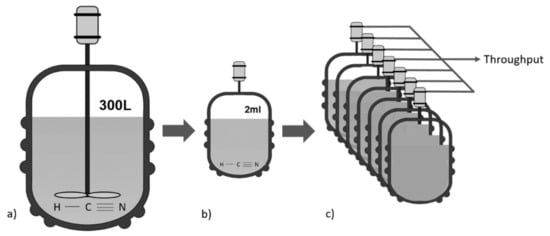 Simplified, schematic representation of the concept of miniaturization. (a) Illustration of a batch reactor (300 L), (b) a miniaturized reactor (2 mL), and (c) outscaling—the coupling of multiple micro-reactors in parallel for higher throughput.