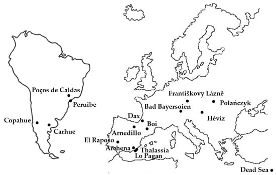 The origins of the 16 MS samples were Carhué and Copahue (Argentina), Peruibe and Poço de Caldas (Brazil), Františkovy Lázně (Czechia), Terdax (France), Bad Bayersoien (Germany), Hévíz (Hungary), Dead Sea (Israel), Polanczyk (Poland) and Archena, Arnedillo, Caldes de Bohí, El Raposo, Lo Pagan and Thalassia (Spain)—see Figure 1.
