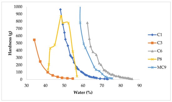 Regarding the instrumental texture of the pastes (RM/DW), the hardness diminishes as their water content rises, following a negative exponential curve. This was not the case for the pastes (RM/DW) based on peat that reached a maximum hardness value. It should be noted that the product MC9, as it is organic, behaved in this regard like a clay, as can be seen in Figure 2. In this figure, we have limited ourselves to including only three inorganic RMs—C1, C3 and C6—and two organic ones—P8 and MC9—for clarity [].