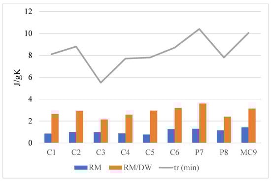 We also provide the mean (Cp) data obtained from the pastes (RM/DW) prepared with the inorganic and organic materials in Table 4. These results are in line with those obtained in prior work and, overall, the (Cp) values of the organic materials were higher than those of the inorganic materials [,,,,,,,,,].