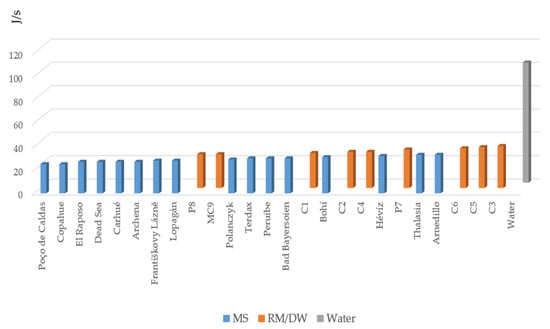 - Calculation of the (Cp) of the MSsThe equation proposed by Armijo et al. [] with which the specific heat of a peloid can be calculated as a function of its ash (A) and water (W) contents is:Cp = 1.26023 + 0.02926 (W) − 0.00628 (A) + 0.000063 (W) (A)