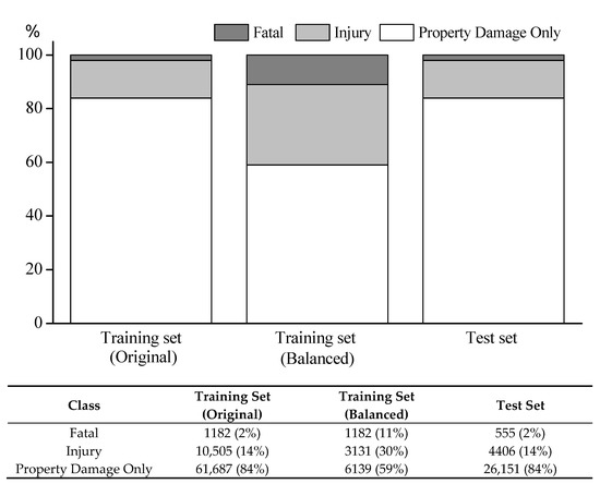 This paper employs the undersampling approach in order to circumvent overfitting and longer duration in learning time. In this setting, all observations of the minority class are kept, while those of other classes are randomly selected and readjusted their size for the sub-training set. We cannot achieve a perfect balance since the sample size of Fatal crashes is too small (i.e., the relative proportion of the Fatal class in the original training set is about 2%, as shown in Figure 2), but mitigate the imbalanced class distribution (i.e., the relative proportion goes up to 11%). The detailed share and frequency distribution of each class for both training and test data sets are provided in Figure 2.