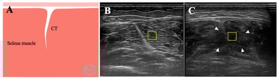 Ultrasound images of central tendon of soleus muscle. (A). Graphic representation of the ultrasound image of the soleus muscle; (B). Ultrasound imaging of health athlete; (C). Ultrasound imaging of an athlete with soleus muscle injury. Ultrasound imaging of patients group shows muscle fiber disorganization at the level of tear (arrowhead). CT, central tendon; ROI.
