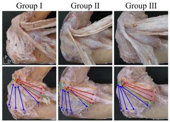 Classification of anterior bundle (AB), posterior bundle (PB), and common tendon (CT) and digitized parts (left side, medial view). Group I: the AB, PB, ACT, and PCT have independent forms. Group II: the AB, ACT, and PCT have independent forms, and the PB has an unclear form. Group III: The AB, PB, ACT, and PCT have unclear forms. 1: anterior common tendon (ACT). 2: posterior common tendon (PCT). 3: anterior bundle (AB). 4: posterior bundle (PB). 5: joint capsule. 6: humerus. 7: ulna. P: proximal. D: distal. Anterior common tendon (orange line): A line connecting the center of the distal end of the attachment and the proximal end of the tendon fibers located at the distal end. Posterior common tendon (green line): A line connecting the center of the distal end of the attachment and the proximal end of the tendon fibers located at the distal end. Anterior band of the AB (red line 1): Group I and Group II are the anterior edge of the AB, and Group III is the fiber bundle located at the posterior edge of the ACT. Central band of the AB (red line 2): A line connecting the midpoint between the origin of the anterior edge of the AB and the origin of the posterior edge of the AB, and the midpoint between the insertion of the anterior edge of the AB and the insertion of the posterior edge of the AB. Posterior band of the AB (red line 3): Group I and Group II are the posterior edge of the AB, and Group III is the fiber bundle located at the anterior edge of the PCT. Anterior band of the PB (blue line 1): Fiber bundle or joint capsule located at the posterior edge of the PCT. Anterior central band of the PB (blue line 2): Group I is the anterior edge of the PB, and Group II and Group III are the fiber bundles or the joint capsules located at about 2 mm anterior from the medial epicondyle tips of the humerus. Posterior central band of the PB (blue line 3): Group I is the posterior edge of the PB, and Group II and Group III are the fiber bundles or the joint capsules located at about 2 mm posterior from the medial epicondyle tips of the humerus. Posterior band of the PB (blue line 4): Fiber bundle or joint capsule located at the medial proximal end of the olecranon.