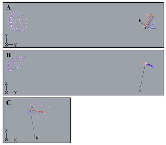 Three-dimensional construction of the AB, PB, ACT, and PCT (left side). (A): medial view. (B): vertical view. (C): distal view. a: medial epicondyle tip of the humerus. b: lateral epicondyle tip of the humerus. Purple point: head of the humerus. Orange line: anterior common tendon. Green line: posterior common tendon. Red line: anterior bundle. Blue line: posterior bundle.