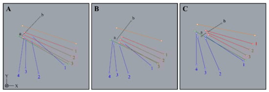 The ACT and PCT were digitized at a total of two points at the proximal and distal ends of the attachment and defined as the ACT and PCT, respectively. The AB was digitized at a total of six points of the origin and insertion, and they were defined as the anterior band, central band, and posterior band, respectively. The PB was digitized at a total of eight points of the origin and insertion, and they were defined as the anterior band, anterior central band, posterior central band, and posterior band. In previous research [,], the PB of Group I originated from the medial epicondyle of the humerus, and the average width of the origin was about 4 mm. Thus, the digitized parts of the anterior central band and posterior central band in Group II and Group III were the fiber bundles or joint capsules located about 2 mm anterior and 2 mm posterior from the medial epicondyle tips of the humerus, respectively. Rhinoceros 3D software (McNeel, Seattle, WA, USA) was used to construct the three-dimensional models (Figure 3).