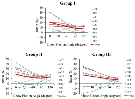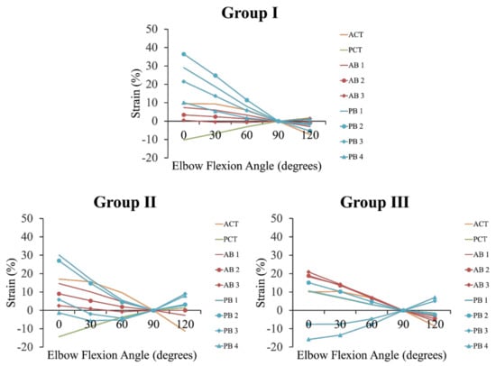 The ACT was taut with elbow extension in all groups. The PCT was taut with elbow flexion in Group I and Group II, but the PCT in Group III was shortened with elbow flexion. For the AB, the anterior band was taut with elbow extension in Group I and Group II, and the posterior band was taut with elbow flexion in Group I and Group II. However, all bands of the AB were taut with elbow extension in Group III. The PB strain patterns were different for the groups (see Figure 4 and Figure 5, Table 1).
