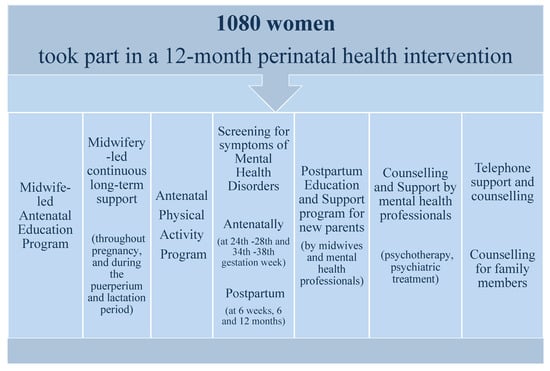 The aim of this study is (a) to investigate if a perinatal health intervention (12 month) that combines (i) continuous long-term midwife-led breastfeeding support (antenatal education and continuous counseling/lactation support), with (ii) the psychosocial support of women (early and continuous mental health screening, psychosocial/psychiatric care—when necessary—and monitoring), is associated with the initiation and duration of exclusive and any breastfeeding and (b) to identify the factors that are related with the duration of exclusive and/or any breastfeeding.