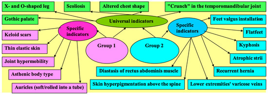 The ranking of the most common defects depending on their diagnostic significance made it possible to identify universal and age-specific pathognomonic indicators for early diagnosis of injury predisposition [17]. For persons in Group 2, such indicators became the asthenic body type, with joint hypermobility, thin elastic skin, keloid scars, and soft auricles; for persons of the second adulthood period—kyphosis, skin hyperpigmentation above the spine flatfoot with valgus installation, rectus muscle diastasis, atrophic striae, recurrent hernias, and lower-limb varicosity. Universal pathognomonic indicators, such as “crunch” in the temporomandibular joint, a gothic palate, altered chest shape, scoliosis, and X- and O-shaped legs are important for people of any age.