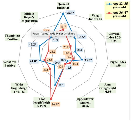 The asthenic body-type, identified via the Quetelet, Varga, and Pignet indices, was more common in Group 1, and its diagnostic value significantly decreased with age (Figure 2). Increased bone length (dolichostenomelia) proved to be a leading sign of connective tissue dysplasia. While it was diagnosed in more than half of the subjects (through foot length/height ratio), it was much more prominent in older adults (Group 2).