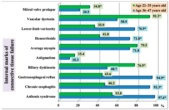 Significant changes in glycosaminoglycan, type I and III collagen of the anterior abdominal wall have been shown to occur with age [11]. This may have determined a greater percentage of rectus muscle diastasis and recurrent hernias in older adults in our study. External signs of connective tissue failure are quite often combined with a specific pathology of internal organs that is connected with the systemic nature of this pathology [12]. Defects in connective tissue components lead to decreased stability and strength of connective tissue structures of various organs, determining clinical symptoms and a variety of complaints [13]. In our study, asthenic syndrome was predominant in the subjects, which may be associated with vegetative imbalance. Every third study participant in Group 1 had mitral valve prolapse. With age, the prevalence of this anomaly decreased significantly. By reducing the elasticity of the valve cusps and the addition of sclerodegenerative changes, this pathology contributes to the development of organic heart disease that was confirmed by other studies [10]. The higher percentage of lower-limb varicosity and hemorrhoids found in our study may be due to progressive structural disorders in the walls of arteries, veins, and their valve apparatus [14].