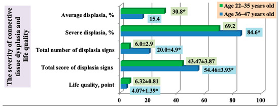 The severity of connective tissue dysplasia and life quality in persons with frequent post-exercise injuries of musculoskeletal system depending on age (* statistically significant findings).