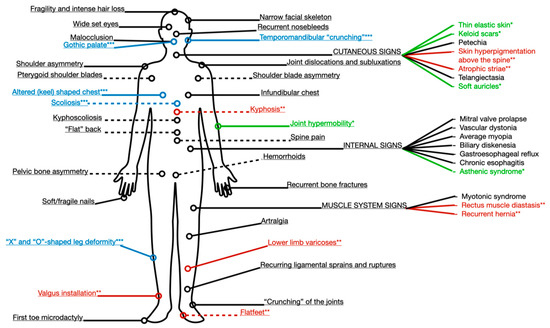 Diagnostic targets to evaluate connective tissue-associated predisposition to recurrent injuries (* green: prevalent and pathognomonic for younger age group, Group 1; ** red: prevalent and pathognomonic for older age group, Group 2; *** blue: significant clinical manifestations for both groups).