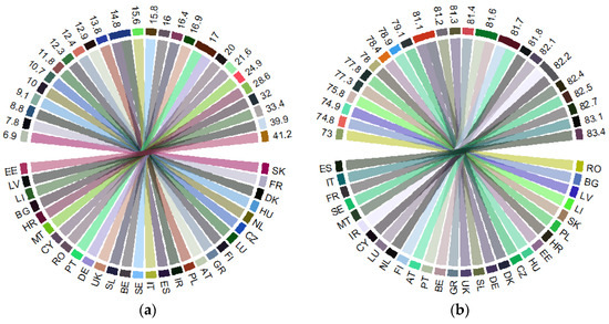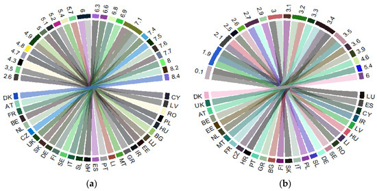 Public health support at the EU level: 2017: (a) “Health government expenditure” (% of gross domestic product, GDP) (HGE); (b) “Hospital services” (% of GDP) (HS). Source: Own process in R version 3.6.3. (R Foundation, Free Software Foundation’s GNU General Public License, Boston, MA, USA), based on Eurostat data [18]. Legend: AT—Austria; BE—Belgium; BG—Bulgaria; HR—Croatia; CY—Cyprus; CZ—Czech Republic; DK—Denmark; EE—Estonia; FI—Finland; FR—France; DE—Germany; GR—Greece; HU—Hungary; IR—Ireland; IT—Italy; LV—Latvia; LI—Lithuania; LU—Luxembourg; MT—Malta; NL—the Netherlands; PL—Poland; PT—Portugal; RO—Romania; SE—Sweden; SK—Slovak Republic; SL—Slovenia; ES—Spain; UK—United Kingdom. Value range: (a) 2.6–8.4 (% of GDP); (b) 0.1–6 (% of GDP).