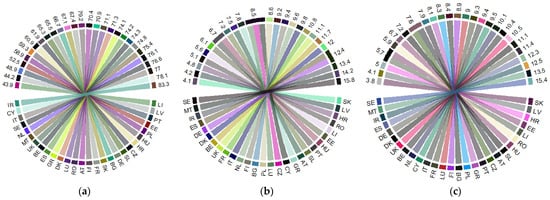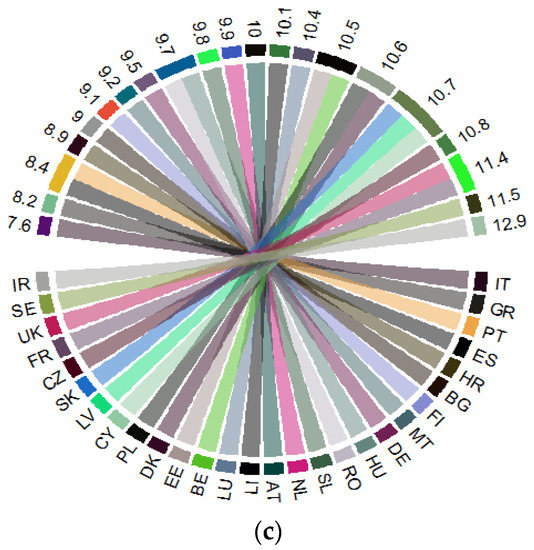 Health indicators in the EU in 2017: (a) “Share of people aged 16+ with good or very good perceived health” (%) (PGPH); (b) “Healthy life years in absolute value at 65—females (years)” (HLY_F); (c) “Healthy life years in absolute value at 65—males (years)” (HLY_M). Source: own process in R version 3.6.3. (R Foundation, Free Software Foundation’s GNU General Public License, Boston, USA), based on Eurostat data [18]. Legend: AT—Austria; BE—Belgium; BG—Bulgaria; HR—Croatia; CY—Cyprus; CZ—Czech Republic; DK—Denmark; EE—Estonia; FI—Finland; FR—France; DE—Germany; GR—Greece; HU—Hungary; IR—Ireland; IT—Italy; LV—Latvia; LI—Lithuania; LU—Luxembourg; MT—Malta; NL—the Netherlands; PL—Poland; PT—Portugal; RO—Romania; SE—Sweden; SK—Slovak Republic; SL—Slovenia; ES—Spain; UK—United Kingdom. Value range: (a) 43.9–83.3 (%); (b) 4.1–15.8 (years); (c) 3.8–15.4 (years).