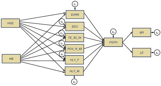 Subsequently, we investigated (i) the direct implications of public health support (reflected by HGE and HS variables) on selected economic and social variables (namely, as a cause of health conditions of older women and men, 65+ years aged, poverty rate of older people, education components, and income/earnings), (ii) the jointly cumulative effects of the above influences on the perceived health of people (as one of the long-term SDG indicators, Goal 3, the most affected by the COVID-19 pandemic crisis), (iii) and the overall impacts of all these cumulated factors on the aging dimensions, namely, birth rate and life expectancy (the last one being also a SDG indicator, included in Goal 3).