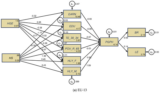 SEM results for the health–aging conjunction, the EU-13 (a), and the EU-15 (b), for the 1995–2017 lapse of time. Source: authors’ process in Stata 16 (StataCorp LLC, Texas, TX, USA).