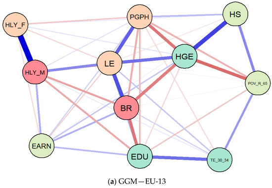 Through the visual rendering, GGMs afford overall insights of the casual dependency and intensity of interaction among our items/variables [46,49]. The GGMs are designed for each considered panel, EU-13 and EU-15, through extended Bayesian information criterion (EBIC) with graphical lasso (EBICglasso).