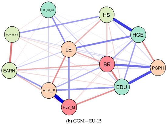 Results of Gaussian graphical models (GGMs), Extended Bayesian Information Criterion with graphical least absolute shrinkage and selection operator (EBICglasso) method, EU-13 (a) and EU-15 (b). Source: authors’ contribution in R programming version 3.6.3. (R Foundation, Free Software Foundation’s GNU General Public License, Boston, MA, USA).