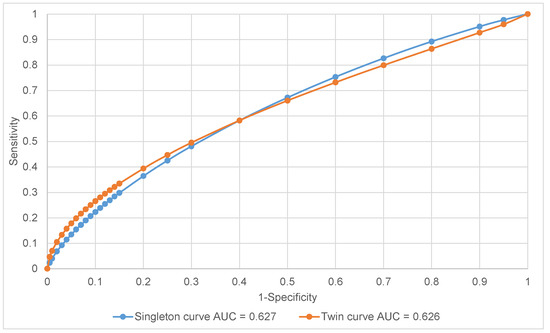 Test performance measures for predicting adverse neonatal outcomes for both growth charts in SGA neonates are presented in Table 3. The ROC curves for singleton and twin charts and AUC are presented in Figure 1. Singleton charts presented higher sensitivity (32.9% vs. 21.7%), yet lower specificity (83.2% vs. 93.6%) compared to twin normogram implementation. Conversely, the twin chart was characterized by higher specificity, which could be a result of selecting growth-restricted twins at the highest risk of developing neonatal complications. The predictive value for a positive result (PV+) appeared to be in favor of the twin chart (49.2% vs. 35.9%), although the predictive value for a negative result (PV−) remained comparable (81.3% vs. 80.7%) for the singleton and twin normograms, respectively. When the gender was considered, the singleton normogram showed higher sensitivity and PV− for females, with enhanced PV+ in favor of males. The twin charts showed higher sensitivity, specificity, and positive predictive value for males, having more accurate negative predictive value for female gender.