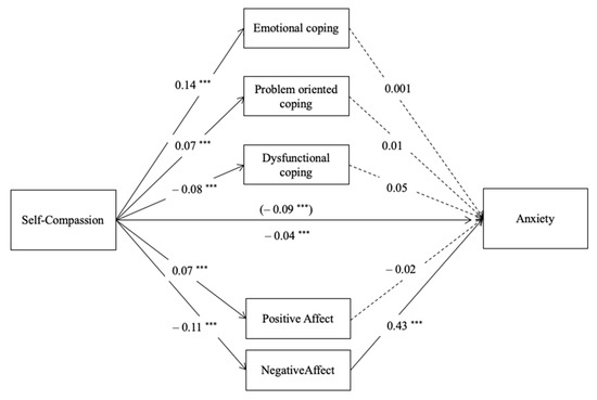 Parallel mediation model with path coefficients (unstandardized): self-compassion, positive affect, negative affect, emotional coping, problem-oriented coping, dysfunctional coping, and anxiety (M2). Note: *** p < 0.001, c’ (direct effect) above the line and c (total effect) below the line, dashed lines are not-significant paths.