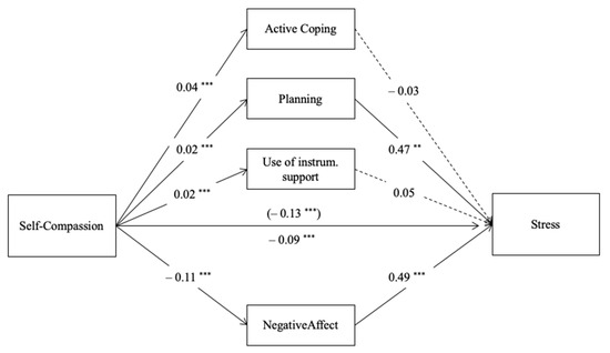 Parallel mediation model with path coefficients (unstandardized): self-compassion, negative affect, active coping, planning, use of instrumental support coping and stress. Note: ** p < 0.01, *** p < 0.001, c’ (direct effect) above the line and c (total effect) below the line, dashed lines are not-significant paths.