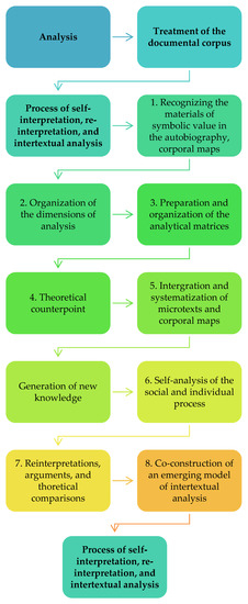 Consequently, we sought to understand such subjective positionings, which Davies and Harré [41] defined as conversational phenomena, as a social interaction capable of generating social results. Standing out among these results are interpersonal relationships, since the subjective positioning implies at the same time the positioning of other subjects and social objects. Consequently, through positioning, social orders are generated or regenerated. From this perspective, conversation is understood as a set of acts of speaking; that is, it involves expressions with illocutive strength, capable of producing social effects [42]. The social effects that interest us here reproduce the patriarchal domination inscribed in social gender relations and those that collaborate in their transformation. To analyze these processes, we have followed an order of 8 phases illustrated in the following diagram (Figure 2):