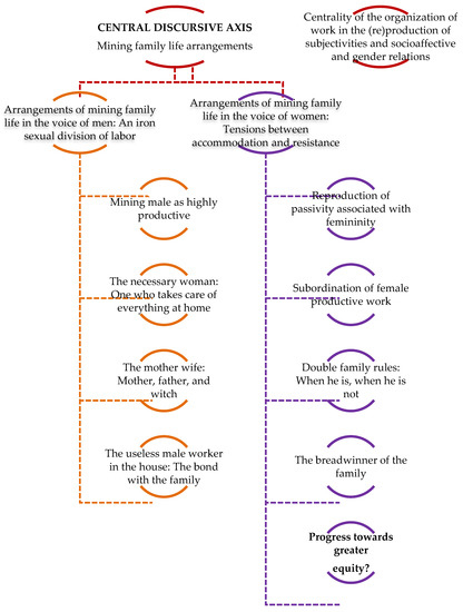 We organized the results based on a survey of a broad discursive focus that we denominate “Arrangements of mining family life: The centrality of the organization of the work in the (re)production of subjectivities and socioaffective and gender relations.” With the analysis, we sought to interpret how, through the discourse on work and its organization by shifts, subjective positionings and socioaffective relations are constructed. Based on this central focus, we identified two associated focuses. The first, sustained entirely by the male mining workers interviewed, strictly reproduces a traditional sexual division of the work, practically distributing the production tasks to men and the reproduction tasks to women. The second, confirmed by the statements made by women, gives an account of some tensions, although far from subverting or transforming the gender order that seems to be reproduced with particular strength by the organization of the mining work. We developed a section in which, as we present the interpretations regarding the subjective positions produced by the discourse and link them with fragments of the discourse of the interviewees, we sought to specify the theoretical and epistemological frameworks based on which we made our interpretation proposals. The following is a summary chart that we develop more extensively below (see Figure 3):