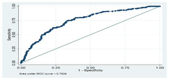 Moreover, Table 3 reports our main estimates for the full sample, and also analyses possible gender divergences. Column 1 presents the OR and Column 2 defines confidence intervals at the 95% level, for each sample. As expected, our empirical findings validate our main hypotheses: low QoL during the crisis period has a large and significant association with both individual recession and pre-recession exposure characteristics. In addition, Figure 1 plots the Receiver Operating Characteristic (ROC) analysis. The relation to the area below the curve is used as a measure of the predictive power of the estimated model. In our approximation, the curve of 0.75 represents acceptable discrimination for the model presented [20].