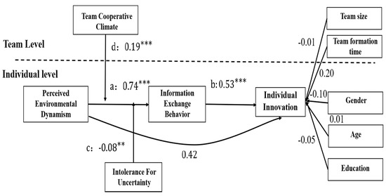 | H5: Moderating effect of team cooperative climate on (perceived environmental dynamism → information exchange behavior → individual innovation) with a mediator | d × b: 0.10 (95% CI: 0.028, 0.185) |