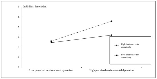 | H4: Moderating effect of intolerance for uncertainty on (perceived environmental dynamism →information exchange behavior → individual innovation) with a mediator | c × b: −0.04 (95% CI: −0.076, −0.004) |