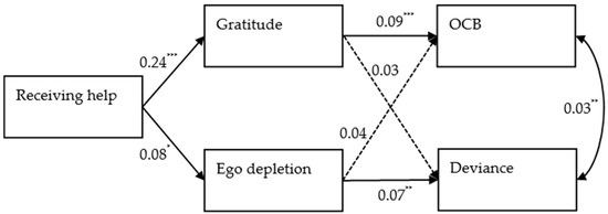 Hypothesis 3 stated that gratitude mediated the effect of receiving daily help on OCB. Following Bauer, Preacher, and Gil [59], we computed the indirect effects as the product of path a (daily receiving help to gratitude) and path b (gratitude to OCB), plus the covariance between them (i.e., indirect effect = path a × path b + cov [a, b]). Bootstrapping results revealed that the indirect relationship between receiving help daily and OCB via gratitude was significant (indirect effect = 0.02, 95% CI = [0.009, 0.038]). Thus, Hypothesis 3 is supported. Hypothesis 4 stated that ego depletion mediated the effect of daily receiving help on deviance. Following the same procedures as those explained above, bootstrapping results revealed that the indirect relationship between receiving help daily and deviance via ego depletion was significant and positive (indirect effect = 0.01, 95% CI = [0.001, 0.014]). Thus, Hypothesis 4 is supported.