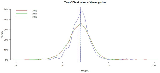 Time trends in the distribution of haemoglobin (Hb) in 2016, 2017, and 2018.