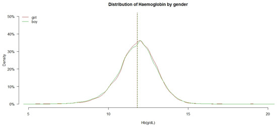 Figure 2 shows the density distribution and mean of Hb among 6- to 23-month-old IYC in boys and girls. The color curves show the density distribution of Hb in gender, which were very similar in boys and girls. The colored lines which represent the mean of Hb in different genders almost coincide. The mean Hb of boys and girls was 11.84 ± 1.23 g/dL and 11.85 ± 1.21 g/dL, respectively, and the mean was not significantly different in each gender (F = 5.672, p = 0.017).
