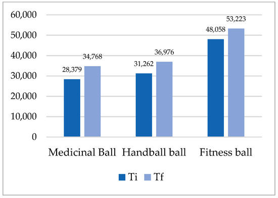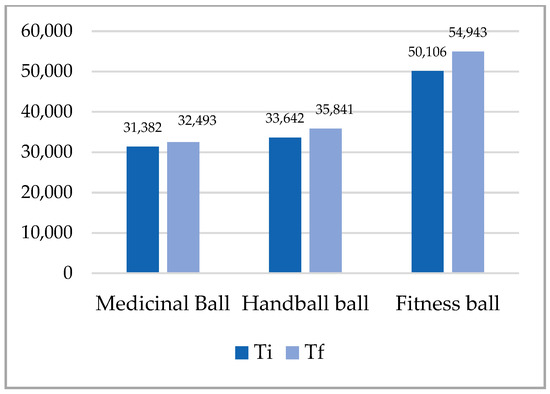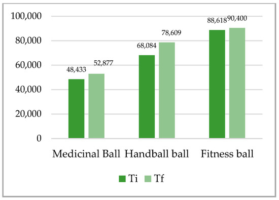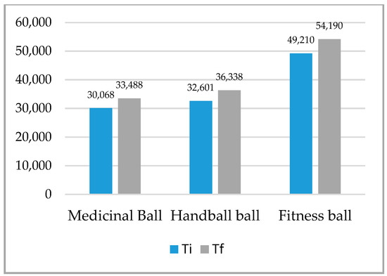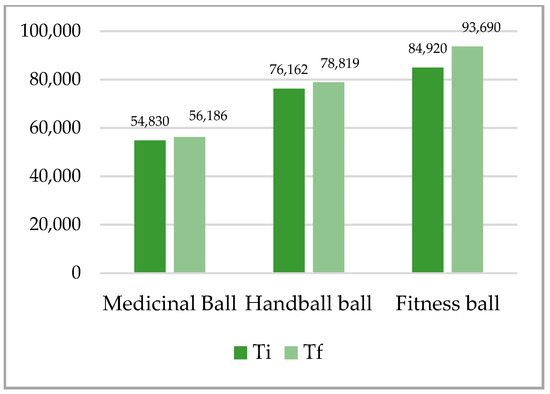 Balls of different compositions, with different characteristics of elasticity and adhesion, as well as with different sizes and weights, are used in the practice of physical activities and in therapy in order to improve the static and dynamic body balance [2,3,4], and the proprioception and strength [18,19,20], as well as in neuro-muscular and functional rehabilitation [21,22,23,24]. The balls that are used in physical activities are made by a specific technology from materials such as butadiene rubber, from polyurethane and polyvinyl chloride. In our study, we used three types of balls, namely: medical balls (butadiene rubber), handball balls (polyurethane) and fitness ball (polyvinyl chloride). Butadiene rubber is an elastic polymer resulting from the polymerization of butadiene, which is the most important monomer and which is characterized by the following properties: good insulator, low elasticity, good water resistance and a remarkable abrasion resistance [25,26]. Polyurethane (PU) balls, a composite material, versatile, stronger and more resistant than PVC, are the closest in terms of technical characteristics to natural leather, with the following properties: high wear resistance, water-repellent effect, softness at low temperatures, and good elasticity allowing for the maintenance of sphericity and good controllability of the ball [27,28]. Polyvinyl chloride (PVC) is a versatile polymer with varied applicability, being a very durable material, with high strength, resistance to climate change and good geometric stability [29]. The research on the effects of the use of different types of balls on the parameters of static balance and general force focused on the development of throwing force [30] and improvement in technical sports skills [31,32].