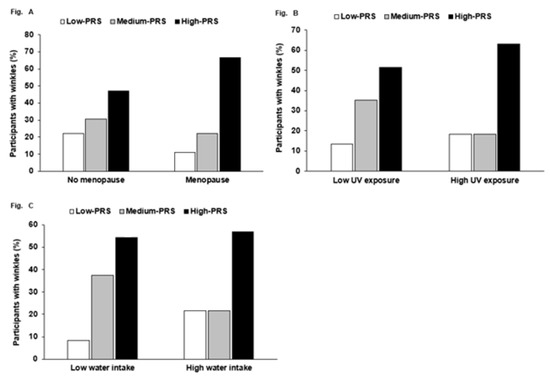 The frequency distribution of participants having wrinkle risk in the three risk groups: polygenetic risk scores (PRSs) according to menopause, UV exposure, and water intake. PRS was calculated by summing the number of risk alleles of three selected SNPs from a genome-wide association study (GWAS) with wrinkle risk, and PRSs were categorized into three groups by the tertiles (low PRS, medium PRS, and high PRS). PRS had an interaction with menopause, UV exposure, and water intake. The incidence (%) of high wrinkling in the three PRS groups in (A) no menopause and menopause, (B) low and high UV exposure (cutoff: three scores of the places held in significant activity during the day), (C) and low and high water intake (cutoff: 2 cups/day).