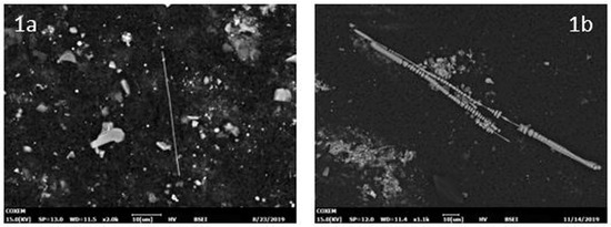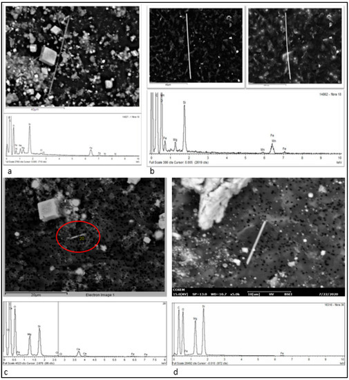 The asbestos fibers were classified on the basis of their shape, dimensional characteristics, and EDS spectrum, as follows, according to international guidelines and as specified in Section 2.2. Endpoints paragraph: (1) crocidolite; (2) amosite; (3) anthophyllite asbestos; (4) tremolite/actinolite asbestos (Figure 3); (5) chrysotile/asbestiform antigorite.