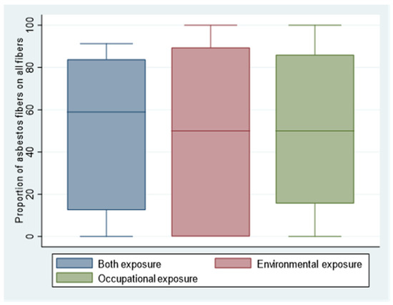 Not only were asbestos fibers detected, but a considerable amount of other inorganic fibers were too. The proportion of inorganic fibers classified as not asbestos, compared to asbestos, was not significantly different according to the kind of exposure (p = 0.987). In individuals exposed only occupationally, considering the median, asbestos was 50% of the total inorganic fibers. In subjects exposed only environmentally, asbestos was 50% of the total inorganic fibers. In both exposures, the percentage of asbestos was the highest (59% of total fibers) (Figure 2).